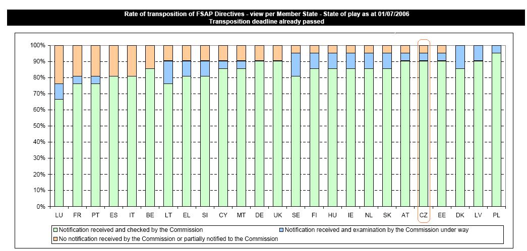 Na základě nejnovějšího hodnocení Evropské komise (EK) se Česká republika výrazně zlepšila v počtu transponovaných směrnic, které patří do balíku tzv. Akčního plánu finančních služeb (FSAP) a je mezi šesti nejlepšími zeměmi, které zavádějí nová evropská pravidla do národní legislativy. „Akční plán zahrnuje opatření, která mají odstranit zbývající právní a regulatorní překážky bránící integraci finančních trhů v celoevropském měřítku,“ říká náměstek ministra financí Tomáš Prouza. Z 23 platných směrnic, u kterých se průběžně sleduje stav transpozice v jednotlivých členských státech, jich Česká republika má k 1. červenci 2006 transponováno plných 90 procent. Hlavní zásluhu na tom mají poslední novely zákona o podnikání na kapitálovém trhu a zákona o kolektivním investování. „V transpozici směrnic finančního trhu se Česká republika řadí mezi nejúspěšnější členské státy EU a české finanční instituce tak mohou těžit z nových evropských pravidel,“ dodává Tomáš Prouza.