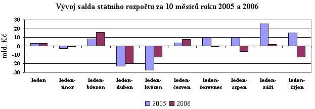 Celkový schodek hospodaření státního rozpočtu ke konci října 2006 činil 12,7 mld. Kč. Dosažený výsledek je o 27,9 mld. Kč horší než byl za deset měsíců v roce 2005 (kladné saldo 15,2 mld. Kč). Proti rozpočtovanému schodku, odpovídajícímu poměrné roční části (- 62,0 mld. Kč), je výsledek lepší o 49,3 mld. Kč. Proti výsledku ke konci září (přebytek 1,5 mld. Kč) se saldo zhoršilo o 14,2 mld. Kč, což bylo ovlivněno převedem zálohy krajům a obcím na čtvrté čtvrtletí roku (úhrada přímých nákladů škol ve výši 16,9 mld. Kč).