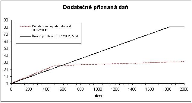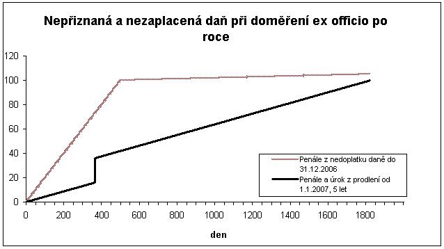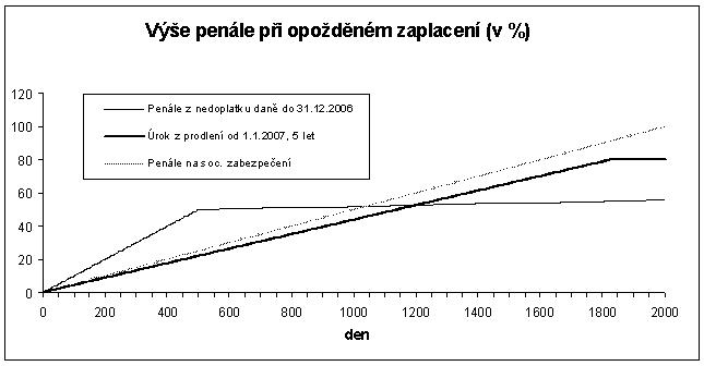 Graf znázorňuje dosud uplatňované kumulované penále za nepřiznání a nezaplacení daně v sazbě 0,2 % denně a průběh součtu nového penále ve výši 20 % sečteného s úrokem z prodlení. Obě sankce však nemusí hradit daňový subjekt současně, protože může zaplatit penále a pak mu běží již jenom úrok z nedoplatku, nebo naopak může zaplatit daň a zůstat dlužen jen penále. I v tom je nový způsob výhodnější.