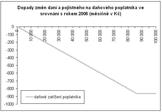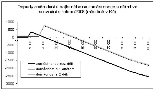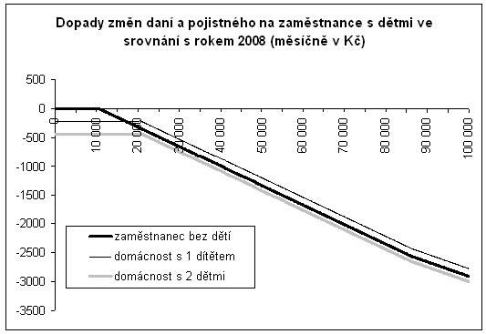 Dopady na veřejné rozpočty v roce 2009 ve srovnání se systémem roku 2008 se odhadují ve výši -13 mld. Kč (snížení sociálního pojistného). Snížení pojistného zaměstnance nemá vliv na snížení daňového základu a základ pro vyměření je tak stále stejný. Dopady změn daní a pojistného na daňového poplatníka ve srovnání s rokem 2008 tak, jak ilustruje následující graf a tabulka, jsou stejné pro různé typy domácností. V modelovém příkladu se vychází z domácností typu: zaměstnanec bez dětí, zaměstnanec s 1 dítětem a zaměstnanec se 2 dětmi.