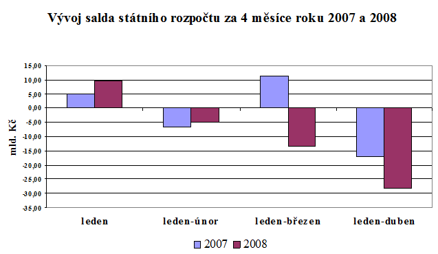 Saldo státního rozpočtu ke konci dubna 2008 dosáhlo záporné hodnoty 28,1 mld. Kč a je horší o 4,5 mld. Kč než by odpovídalo úrovni rozpočtované alikvoty (-23,6 mld. Kč). Proti stejném období roku 2007 je to výsledek horší o 11,1 mld. Kč. Na relativně negativní výsledek hospodaření státního rozpočtu měly rozhodující vliv již zmíněné kapitálové výdaje (transfery do SFDI).