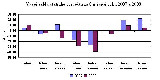 V samotném měsíci srpnu se hospodaření státního rozpočtu zhoršilo o 4,0 mld. Kč (příjmy činily 63,6 mld. Kč a výdaje 67,6 mld. Kč). V roce 2007 skončilo hospodaření v samotném srpnu přebytkem 2,5 mld. Kč (příjmy ve výši 75,5 mld. Kč a výdaje 72,9 mld. Kč). Výrazně nižní příjmy proti srpnu 2007 (o 11,9 mld. Kč) souvisí s loňským usnesením vlády č. 629/2007, kterým se do příjmů kapitoly VPS převedlo z rezervních fondů kapitol 13,9 mld. Kč.