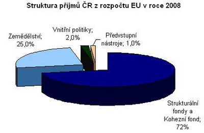 Klíčovou úlohu v pozitivní bilanci ČR ve vztahu k rozpočtu EU za rok 2008 sehrály příjmy ze strukturálních fondů a Fondu soudržnosti EU, které dosáhly celkem 41,9 mld. Kč a tvořily tak téměř tři čtvrtiny celkových příjmů ČR z rozpočtu Unie. Další významnou položku příjmů ČR z evropského rozpočtu představovaly prostředky na Společnou zemědělskou politiku ve výši 14,6 mld. Kč (viz graf č. 2).