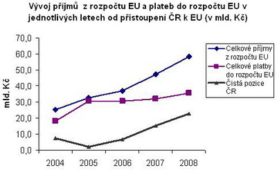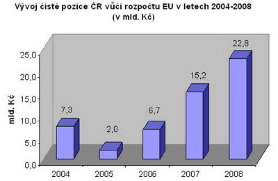 Celkově ČR od 1. května 2004 do 31. prosince 2008 zaplatila do rozpočtu EU 146,6 mld. Kč a získala 200,6 mld. Kč. Kladné saldo čisté pozice České republiky ve vztahu k rozpočtu EU tak dosahuje celkově 54 mld. Kč. Za výrazným nárůstem čisté pozice ČR k evropskému rozpočtu v posledních letech stojí zejména dynamicky rostoucí příjmy ČR z rozpočtu EU, odvody ČR do evropského rozpočtu se zvyšují mírným tempem (viz graf č. 3).