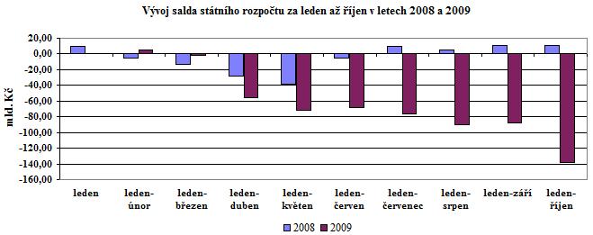 Schodek státního rozpočtu ke konci října 2009 dosáhl 138,1 mld. Kč a je to proti stejnému období roku 2008 výsledek horší o 149,0 mld. Kč. Proti schodku danému rozpočtem po změnách je současný stav horší o 99,4 mld. Kč. Vykázaný schodek je stejně jako v minulých měsících nejhorším výsledkem hospodaření státního rozpočtu za leden až říjen od roku 1993.
