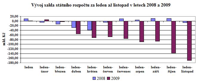 Schodek státního rozpočtu ke konci listopadu 2009 dosáhl 169,4 mld. Kč a je to proti stejnému období roku 2008 výsledek horší o 162,9 mld. Kč. Proti schodku danému rozpočtem po změnách (k 30.9.2009) je současný stav horší o 130,8 mld. Kč. Vykázaný schodek je stejně jako v minulých měsících nejhorším výsledkem hospodaření státního rozpočtu za leden až listopad od roku 1993.