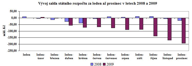 Podle údajů na účtech Ministerstva financí vedených v ČNB dosáhly ke konci roku 2009 celkové příjmy státního rozpočtu výše 974,8 mld. Kč, výdaje byly čerpány v objemu 1167,0 mld. Kč a schodek dosáhl 192,2 mld. Kč, což je proti roku 2008 výsledek horší o 172,2 mld. Kč. Tento předběžný schodek dozná ještě mírných úprav, které souvisejí se závěrečným zúčtováním sdílených daní územním rozpočtům. Zúčtování bude realizováno v prvních pracovních dnech ledna 2010.