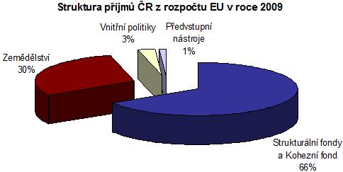 Klíčovou úlohu v pozitivní bilanci ČR ve vztahu k rozpočtu EU za rok 2009 sehrály příjmy ze strukturálních fondů a Fondu soudržnosti EU, které dosáhly celkem 51,9 mld. Kč a tvořily přibližně dvě třetiny celkových příjmů ČR z rozpočtu Unie. Další významnou položku příjmů ČR z evropského rozpočtu představovaly prostředky na Společnou zemědělskou politiku ve výši 23,2 mld. Kč (viz graf č. 2).