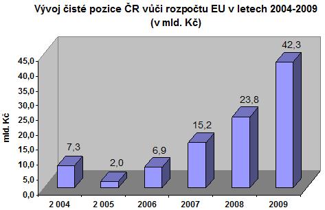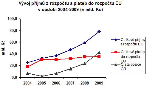 Celkově ČR od 1. května 2004 do 31. prosince 2009 zaplatila do rozpočtu EU 182,5 mld. Kč a získala 280 mld. Kč. Kladné saldo čisté pozice České republiky ve vztahu k rozpočtu EU tak souhrnně dosáhlo 97,5 mld. Kč. Za výrazným nárůstem čisté pozice ČR k evropskému rozpočtu v posledních letech stojí zejména rostoucí čerpání ČR z rozpočtu EU, odvody ČR do evropského rozpočtu se zvyšují mírným tempem (viz graf č. 3).