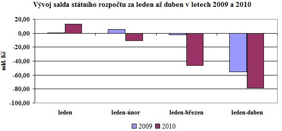 Podle údajů na účtech Ministerstva financí vedených v ČNB dosáhly ke konci dubna roku 2010 celkové příjmy státního rozpočtu 321,5 mld. Kč, celkové výdaje 399,7 mld. Kč a schodek hospodaření 78,2 mld. Kč (v dubnu 2009 vykázán schodek 55,7 mld. Kč).