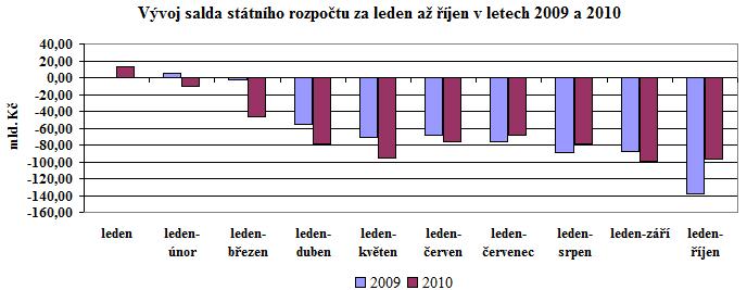 Podle údajů na účtech Ministerstva financí vedených v ČNB dosáhly ke konci října 2010 celkové příjmy státního rozpočtu 834,5 mld. Kč, celkové výdaje 931,2 mld. Kč a schodek hospodaření 96,7 mld. Kč (v říjnu 2010 vykázán schodek 138,1 mld. Kč).