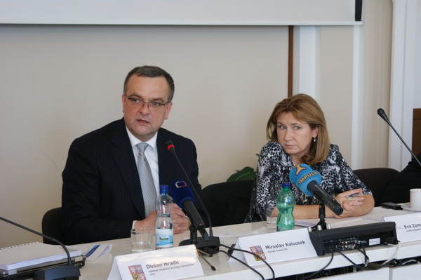 ministr financí Miroslav Kalousek a členka bankovní rady a vrchní ředitelka ČNB Eva Zamrazilová na tiskové konferenci o finanční gramotnosti