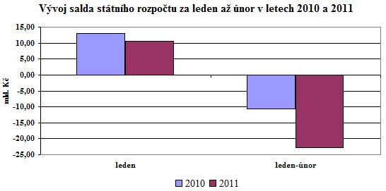 Hospodaření státního rozpočtu skončilo na konci února 2011 schodkem ve výši 22,8 mld. Kč, což je proti stejnému období roku 2010 výsledek horší o 12,2 mld. Kč. Negativně na tento výsledek působily zejména na straně příjmů meziročně nižší transfery přijaté od EU a Národního fondu (o 5,1 mld. Kč) a na straně výdajů meziročně vyšší kapitálové výdaje (o 8,1 mld. Kč).