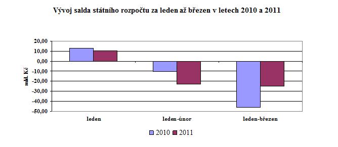 Podle údajů na účtech Ministerstva financí vedených v ČNB dosáhly dosáhly k 31. březnu 2011 celkové příjmy státního rozpočtu 253,4 mld. Kč, celkové výdaje 278,6 mld. Kč a schodek 25,2 mld. Kč (v březnu 2010 vykázán schodek 45,9 mld. Kč).
