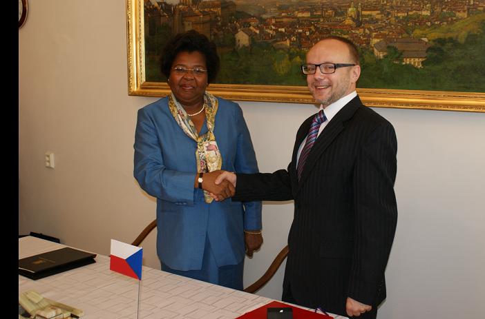 Zleva: Vláda Britských Panenských ostrovů - zastoupená její místopředsedkyní paní Danciou Penn a ČR - zastoupená panem náměstkem ministra financí Ladislavem Minčičem