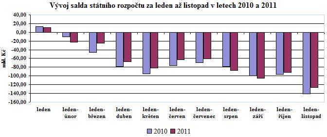 Hospodaření rozpočtu v samotném listopadu skončilo schodkem 34,5 mld. Kč (v listopadu 2010 to bylo 44,0 mld. Kč), když příjmy činily 67,8 mld. Kč (v listopadu 2010 to bylo 63,4 mld. Kč) a výdaje byly čerpány ve výši 102,3 mld. Kč (v listopadu 2010 to bylo 107,4 mld. Kč). Na meziročně vyšších příjmech v samotném listopadu se pozitivně projevilo především vyšší inkaso DPH (o 1,7 mld. Kč), vyšší transfery přijaté od EU a převody z Národního fondu (o 1,5 mld. Kč) a vyšší příjmy kapitoly Státní dluh (o 1,4 mld. Kč). Na straně výdajů se v samotném listopadu v meziročním srovnání pozitivně projevilo zejména nižší čerpání kapitálových výdajů (o 7,3 mld. Kč).
