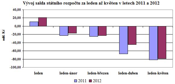 Hospodaření státního rozpočtu skončilo na konci května 2012 schodkem ve výši 79,1 mld. Kč, což je proti stejnému období roku 2011 výsledek lepší o 2,4 mld. Kč. V meziročním srovnání měly na nižší výdaje (o 1,8 mld. Kč) pozitivní vliv především nižší výdaje na stavební spoření o 5,4 mld. Kč. Celkové příjmy jsou meziročně na podobné úrovni.
