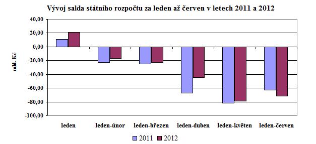 Hospodaření státního rozpočtu skončilo v 1. pololetí roku 2012 schodkem ve výši 71,7 mld. Kč (68,1 % rozpočtu po změnách), což je proti stejnému období roku 2011 výsledek horší o 8,9 mld. Kč. V meziročním srovnání působí negativně na saldo hospodaření státního rozpočtu především na straně výdajů transfery prostředků na regionální školství. V letošním roce byla již v červnu převedena záloha na červenec a srpen, zatímco v roce 2011 byla většina zálohy na 3. čtvrtletí zaslána až v červenci. Dochází tak v meziročním srovnání ke zkreslení výdajů i schodku o cca 10 mld. Kč v neprospěch letošního roku. Po odečtení tohoto vlivu by schodek byl meziročně mírně nižší než v pololetí roku 2011. Na straně příjmů negativně působí meziročně nižší inkaso daňových příjmů (o 6,9 mld. Kč) i nižší příjmy z EU (o 4,1 mld. Kč). Vykázaný schodek a jeho plnění je odrazem předstihu čerpání výdajů (na 48,4 % rozpočtu po změnách) před plněním příjmů (na 46,5 % rozpočtu po změnách) o 1,9 procentního bodu.