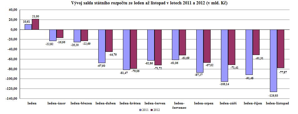 Podle údajů na účtech Ministerstva financí vedených v ČNB dosáhly ke konci listopadu 2012 celkové příjmy státního rozpočtu 961,3 mld. Kč, celkové výdaje 1 039,2 mld. Kč a schodek 77,9 mld. Kč (v listopadu 2011 vykázán schodek 125,9 mld. Kč, tj. o 48,1 mld. Kč vyšší). „ Mojí prvořadou prioritou je dodržení schválené výše deficitu za letošní rok. V bilanci národních příjmů a výdajů plán deficitu určitě splníme. Rizikem zůstávají platby z Evropské unie,“uvedl ministr financí Miroslav Kalousek.