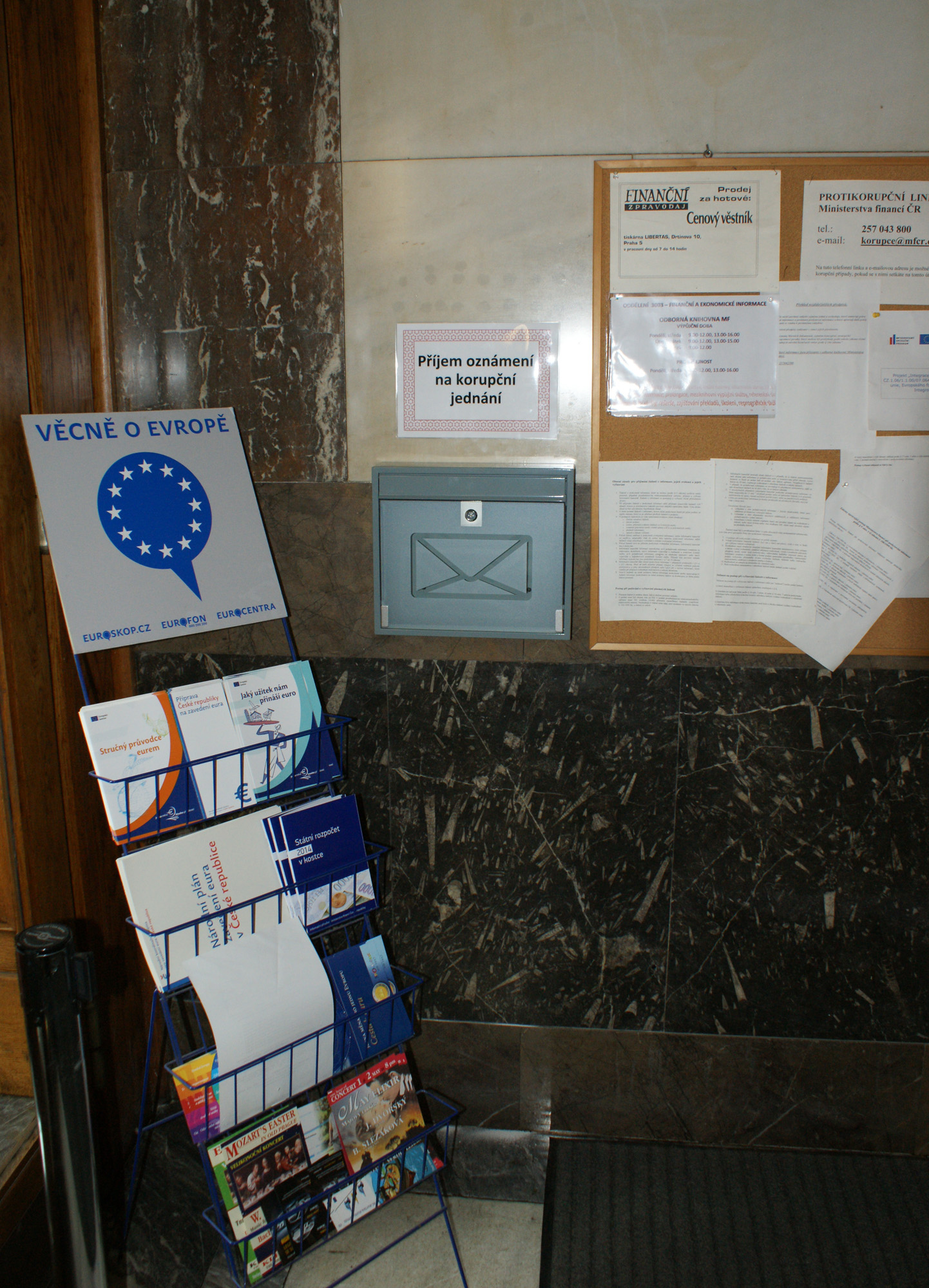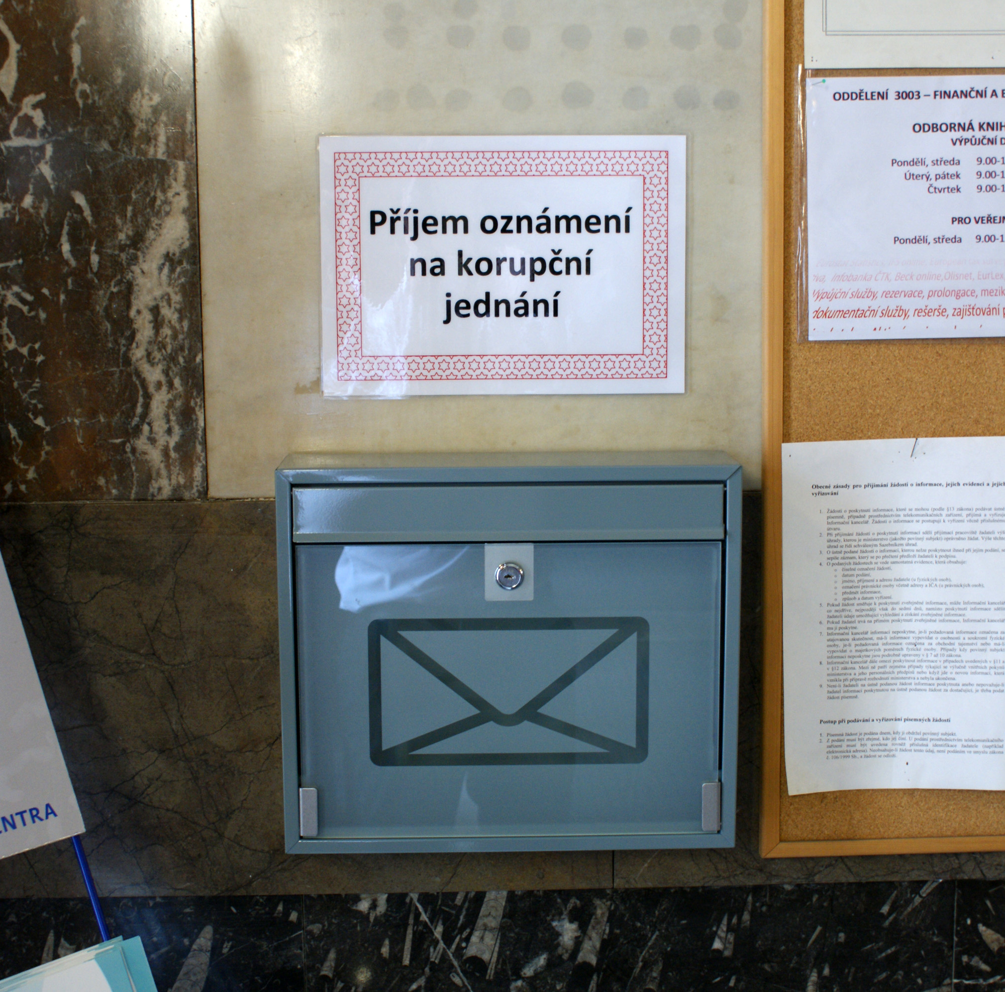 V budově Ministerstva financí v Letenské 15 dnes byla umístěna schránka pro příjem podnětů poukazujících na korupční jednání na ministerstvu. Schránka se nachází ve vstupní hale budovy Ministerstva financí, která je přístupná veřejnosti bez omezení.