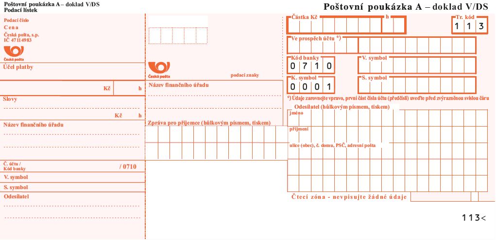 Daňová složenka vypadá na první pohled jako běžná poštovní poukázka typu „A“. Liší se však od ní tím, že je v záhlaví označená jako Poštovní poukázka A – doklad V/DS, přičemž DS znamená daňová složenka. Složenka má v horní části bílý pruh, předtištěný transakční kód (113) a konstantní symbol (0001).