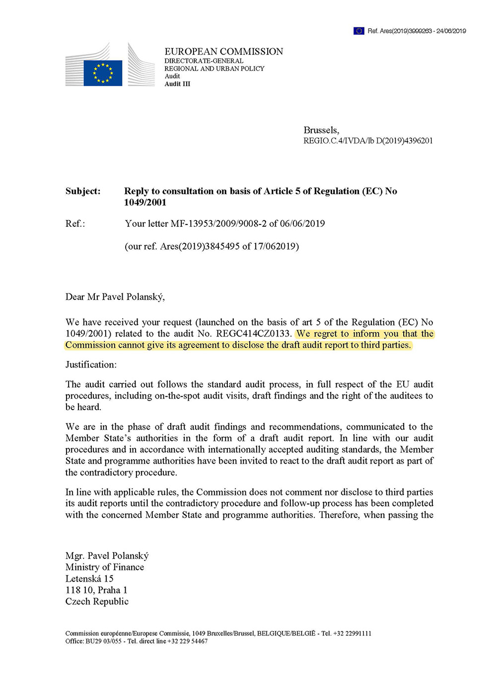 Zveřejnění návrhu auditní zprávy brání zákaz obsažený v článku 4 odst. 2 Nařízení Evropského parlamentu a Rady o přístupu veřejnosti k dokumentům Evropského parlamentu, Rady a Komise, jak Ministerstvu financí sdělila Evropská komise svým dopisem ze 17. června 2019. Dopis opětovně přikládáme, aby bylo zřejmé, že tvrzení o jeho domnělé neexistenci nemají reálný základ.