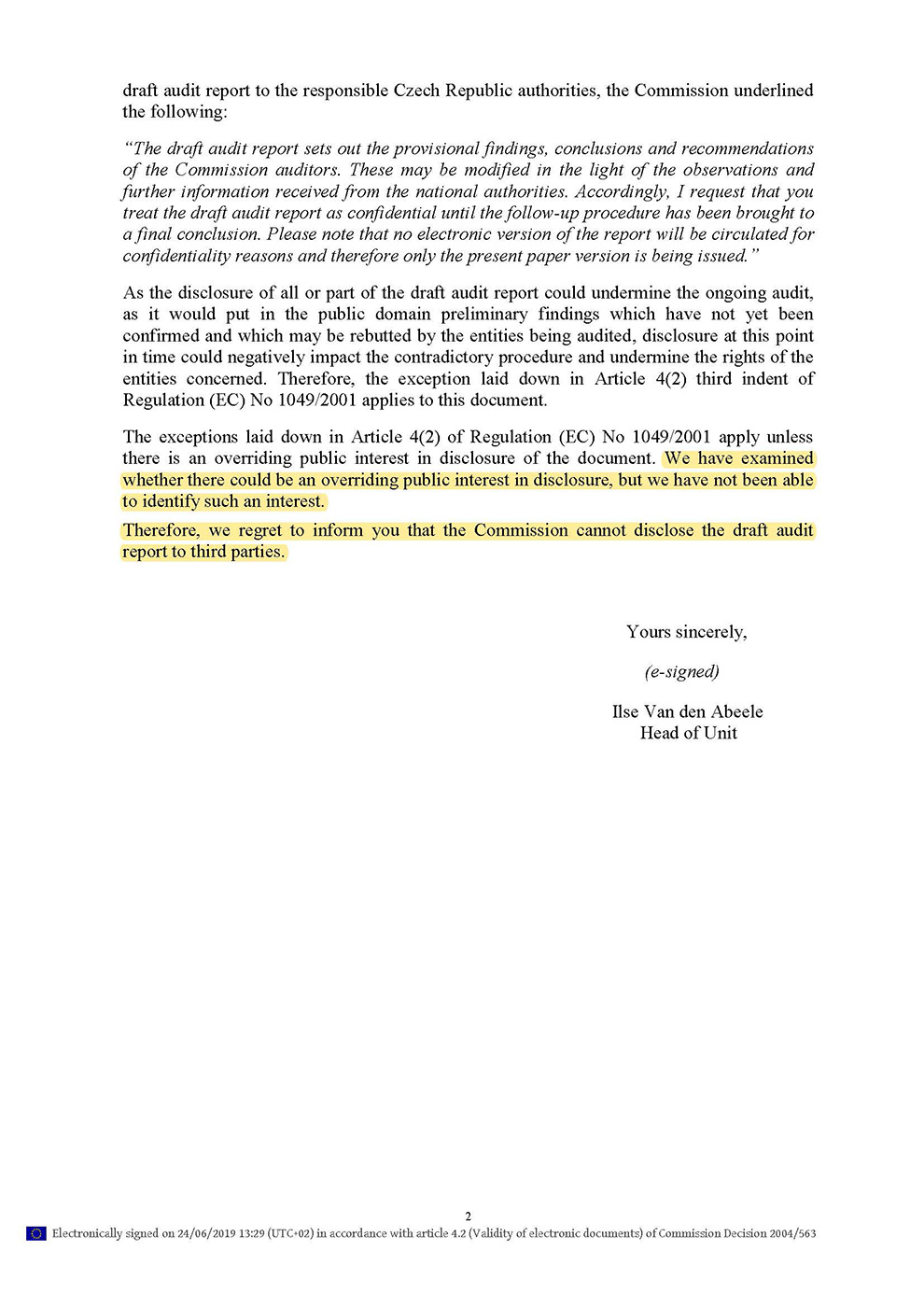 Z tohoto dopisu výslovně plyne, že návrh auditní zprávy nesmí být poskytnut žádným jiným subjektům než těm, kterým byl tento dokument Evropskou komisí adresován. Podle Evropské komise by bylo možné dokument poskytnout pouze v případě, že by existoval převažující veřejný zájem na jeho zpřístupnění. V tomto konkrétním případě však Komise jasně konstatovala, že žádný veřejný zájem na zveřejnění dokumentu neidentifikovala. Zveřejnění celého nebo i jen části návrhu auditní zprávy by podle Evropské komise mohlo ohrozit probíhající auditní proces, mohlo by mít negativní dopad na řízení a poškodit tak dotčené subjekty.
