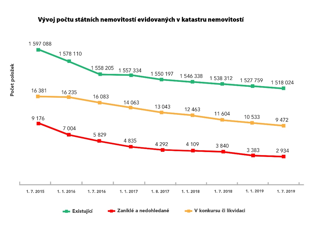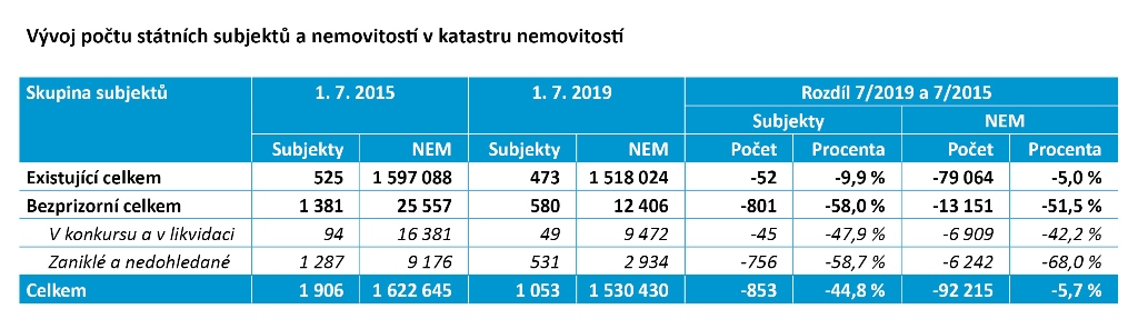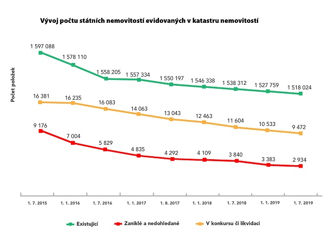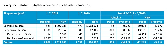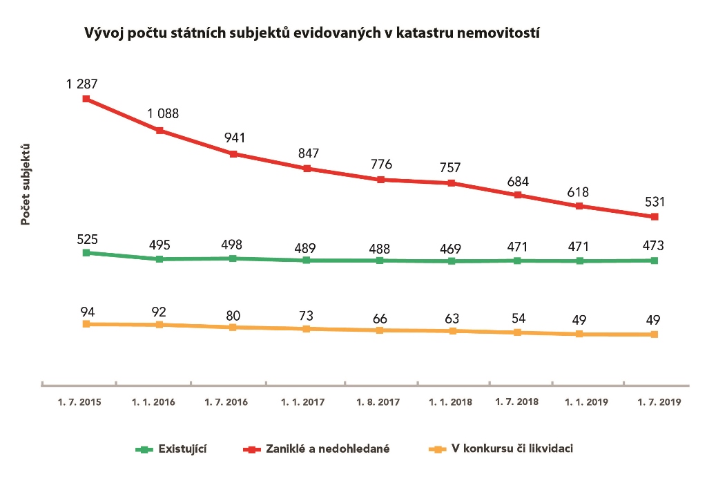Úřad pro zastupování státu ve věcech majetkových (ÚZSVM) dokázal do poloviny roku 2019 snížit počet nemovitostí zapsaných na nedohledané a zaniklé státní subjekty o 68 % (tj. o 6 242 nemovitostí). Zároveň se podařilo snížit počet nedohledaných a zaniklých subjektů o téměř 59 % (tj. o 756 subjektů). Údaje vychází z aktualizovaného materiálu Mapa majetku státu, kterou ÚZSVM vytvořil vlastními silami.