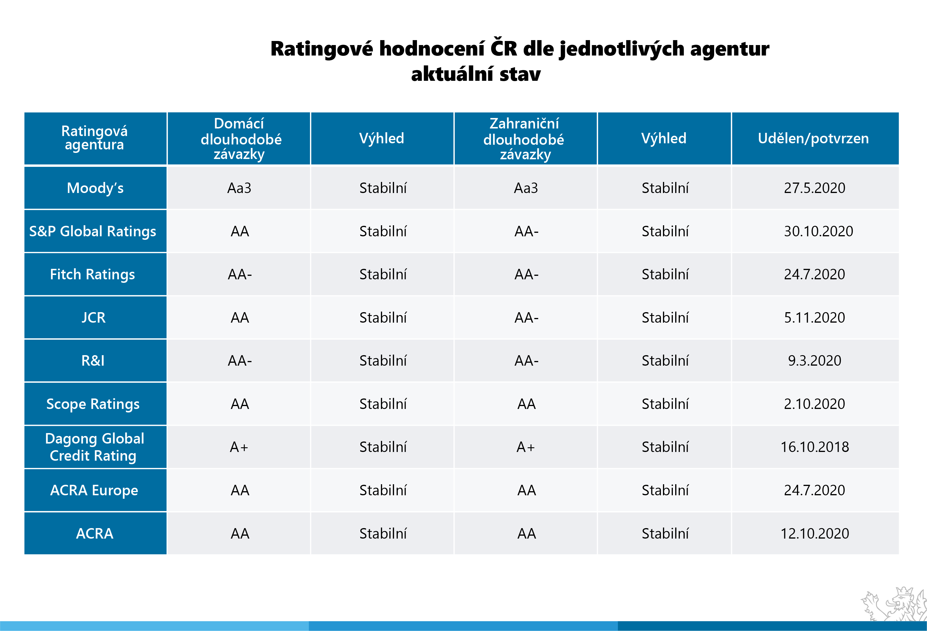 Nejnovější hodnocení ratingových agentur S&P, Japan Credit Rating Agency (JCR) a Fitch potvrdila vysokou úvěrovou spolehlivost České republiky, která se tak navzdory zhoršenému ekonomickému vývoji v důsledku koronavirové pandemie, bude nadále výhodně financovat na domácím i zahraničních trzích.