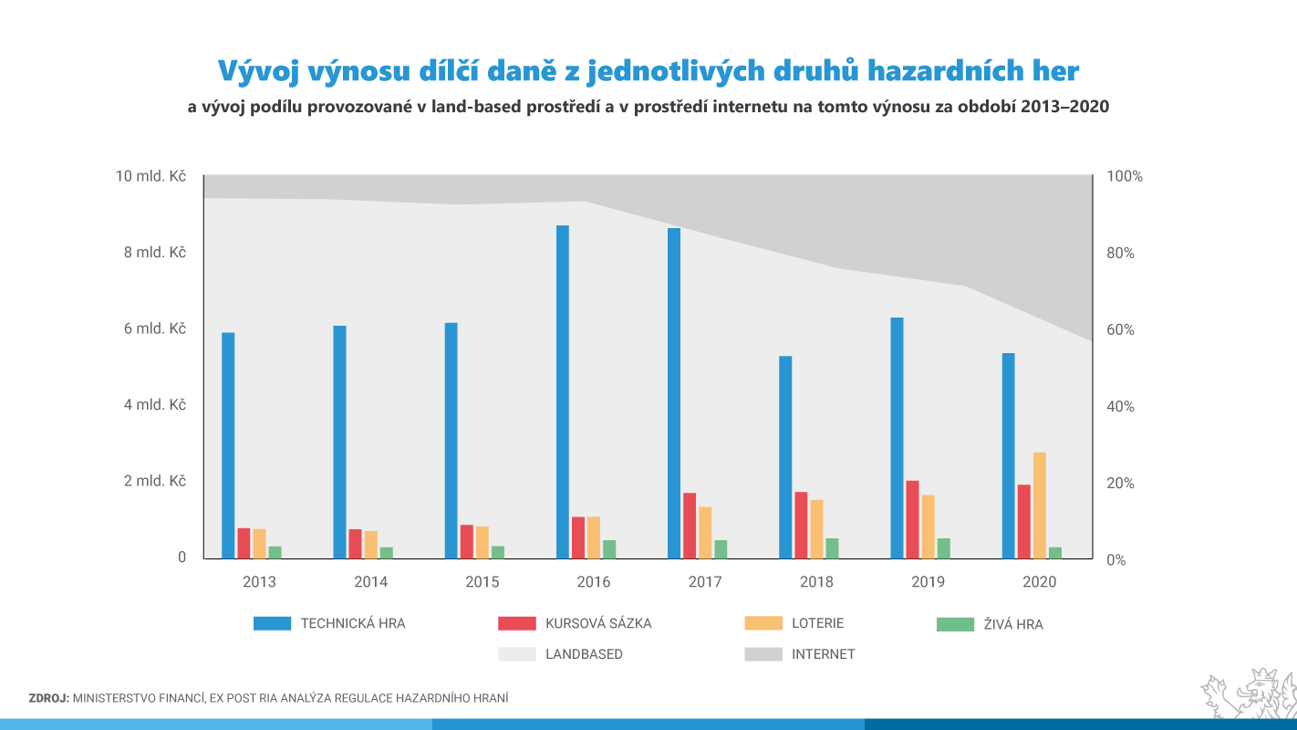Nejvýznamnějším aktuálním trendem v oblasti hazardního hraní je bezpochyby přesun do internetového prostředí, kde se do nabytí účinnosti zákona o hazardních hrách v roce 2017 odehrávalo zhruba jen 10 % objemu her. V roce 2020 už byl tento poměr téměř vyrovnaný, když internetové provozování hazardního hraní činilo zhruba 45 %. Nejvýraznější přesun na internet je možné sledovat u kursových sázek, kde se podíl internetu na daňovém inkasu v posledních osmi letech navýšil o více než 40 procentních bodů na úroveň 91 %. Významný nárůst podílu internetového hraní je zřejmý také u technické hry, a to z 16 % na 40 % celkového objemu.