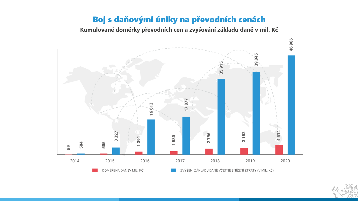 Finanční správa v roce 2020 provedla 249 kontrol zaměřených na převodní ceny mezi spojenými osobami, což přineslo dodatečné doměření daně z příjmů ve výši 1,4 mld. Kč a zvýšení daňového základu kontrolovaných subjektů o 7,9 mld. Kč. Celkem mezi lety 2014-2020 proběhlo už 2 431 kontrol, na jejichž základě byla doměřena daň ve výši 4,5 mld. Kč a byl zvýšen daňový základ o 46,9 mld. Kč. Transfer pricing je nastavení cen transakcí mezi spojenými osobami, kdy jejich nastavení neodpovídající tržním podmínkám vede k nesprávnému stanovení základu daně.