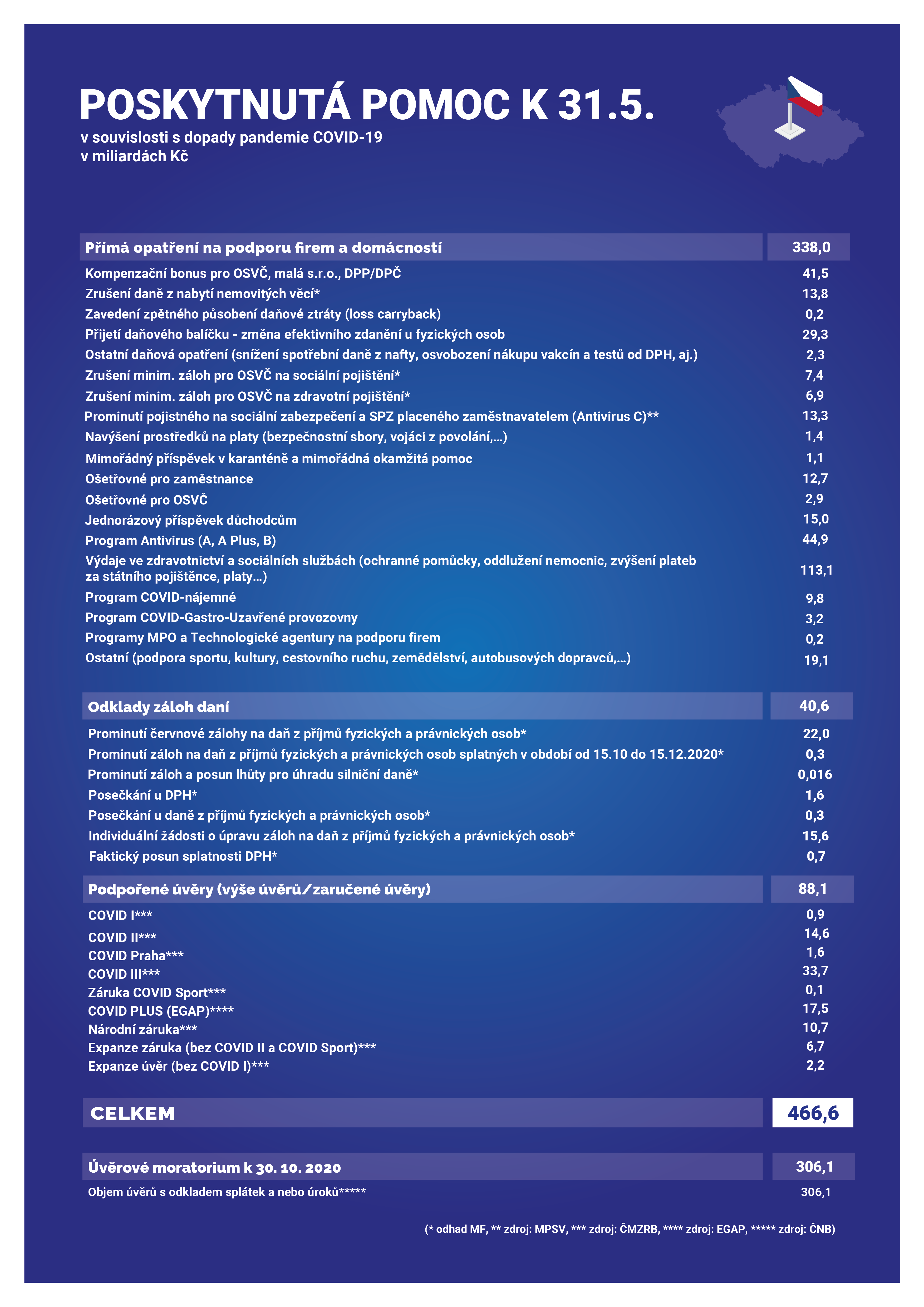 Podrobná data, včetně výše realizované pomoci a výdajů souvisejících s COVID-19, naleznete v přiložených tabulkách (.XLSX, 84 kB).