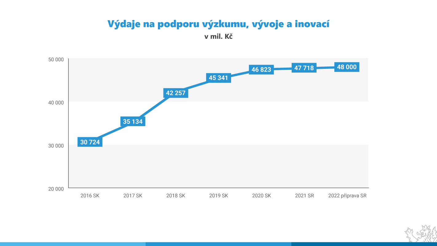 Prioritou státního rozpočtu zůstávají nadále věda a výzkum, stejně jako obrana, kde bude i v době konsolidace docházet ke každoročnímu zvyšování objemu finančních prostředků. Schválený návrh počítá s dalším meziročním zvýšením výdajů na vědu a výzkum, a to o 300 milionů korun na celkových 48 miliard. Také v případě výdajů na obranu je plánován růst, a to v každém roce výhledu až do roku 2024. Celkové výdaje na rok 2022 jsou navrženy ve výši 90,7 mld. Kč, tj. 1,45 % HDP. V porovnání s rozpočtem roku 2021 po změnách (tj. vč. rozpočtových opatření) dochází k nárůstu o 5,3 mld. Kč. Pro rok 2023 jsou navrženy výdaje v objemu 95 mld. Kč, tj. 1,46 % HDP a pro rok 2024 činí výdaje 99,5 mld. Kč, tj. 1,47 % HDP.