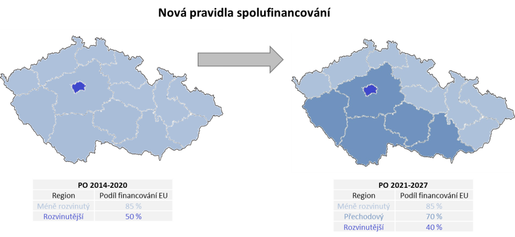 Přechod do nového programového období 2021-2027 pro projekty financované z prostředků EU s sebou přináší nová pravidla spolufinancování. Změna souvisí se zvýšením bohatství České republiky a jednotlivých jejích regionů, protože na projektech financových z prostředků EU se evropské peníze podílejí vždy právě podle rozvinutosti příslušných území.