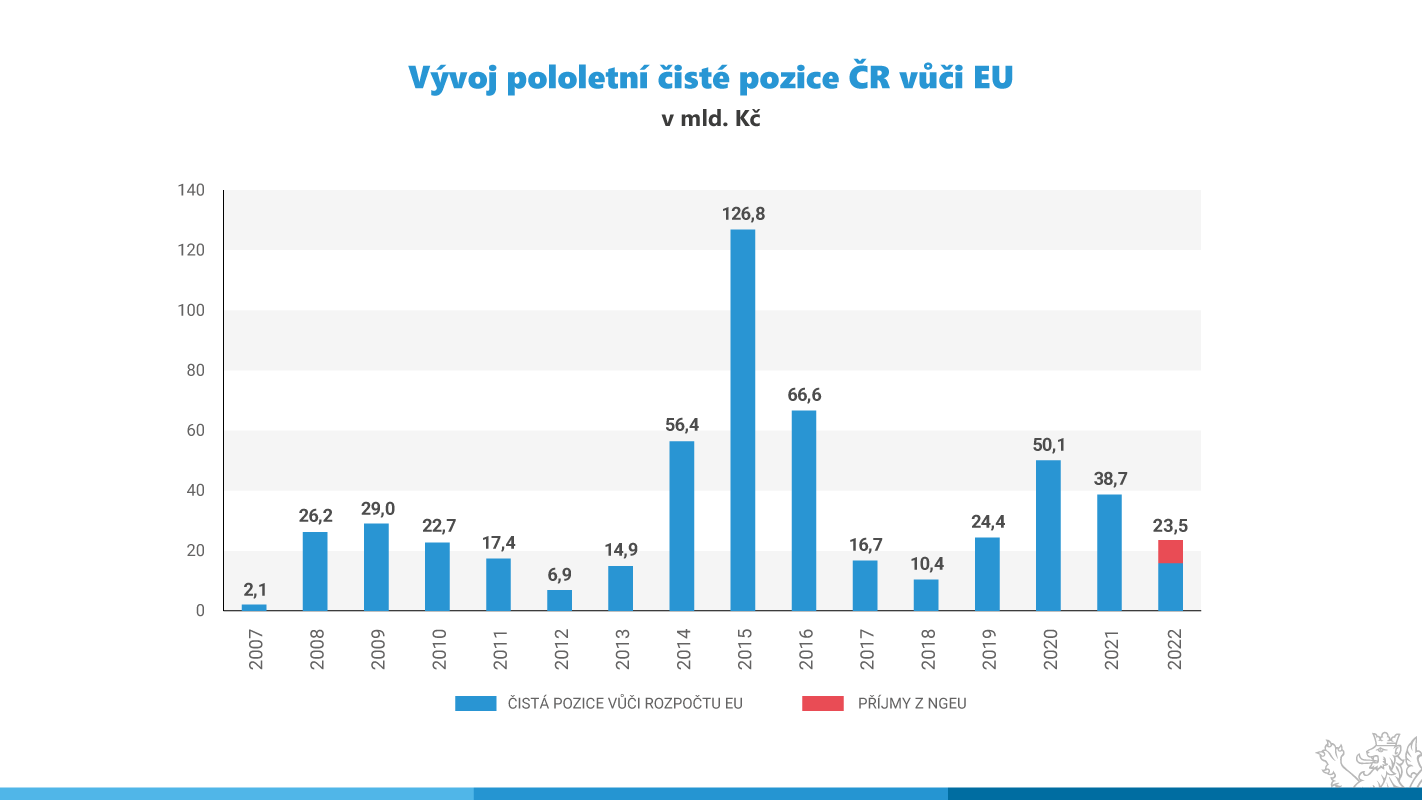 * rok 2022: čistá pozice vůči rozpočtu EU 15,8 mld. Kč + příjmy z NGEU 7,7, mld. Kč = celkem 23,5 mld. Kč.