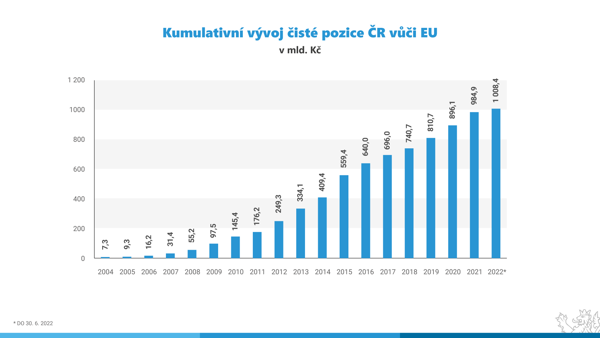Celkově ČR od svého vstupu do EU 1. května 2004 do 30. června 2022 zaplatila do evropského rozpočtu 775,9 mld. Kč a získala zhruba 1,75 bil. Kč. Kladné saldo čisté pozice České republiky ve vztahu k rozpočtu EU tak souhrnně dosáhlo 977,3 mld. Kč. Při započítání příjmů z NGEU činí celkové příjmy 1,78 bil. Kč a celkové kladné saldo za dobu členství České republiky v EU tak překročilo 1 bil. Kč.