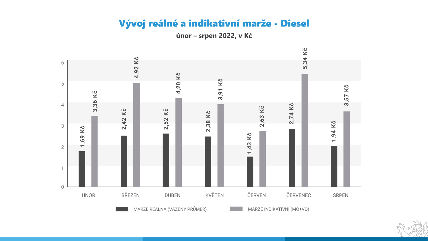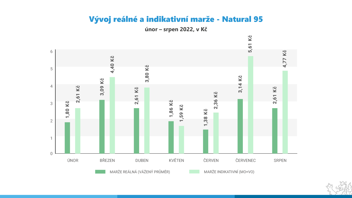 U Naturalu 95 v srpnu klesala indikativní marže jen mírně, a to z úrovně 5,6 Kč na 4,8 Kč za litr, což je stále vysoko nad průměrem loňského roku (2,6 Kč) i vysoko nad úrovní srpnové marže loňského roku (3,0 Kč). MF po vyhodnocení cenových dat za srpen vykazujících klesající trend a značně rozdílné cenové chování čerpacích stanic prozatím nepřistoupí k zavedení plošné cenové regulace na distributory a čerpací stanice. Ve svých kontrolách cen a marží bude MF i nadále pokračovat a vyčká na evropské parametry tzv. windfall tax, která se má podle Evropské komise vztahovat právě i na sektor pohonných hmot.