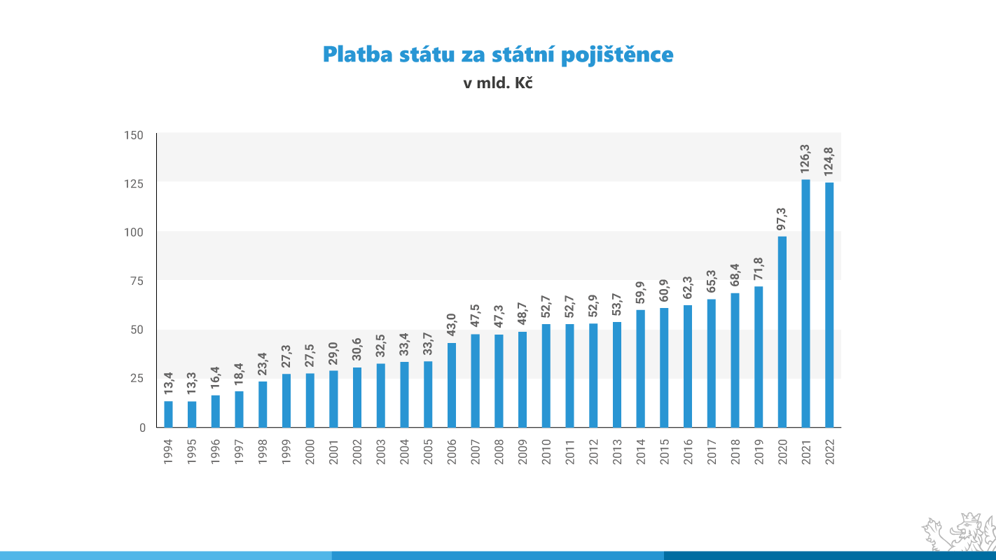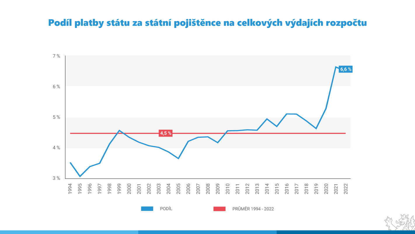 Ministerstvo zdravotnictví bude letos hospodařit s rozpočtem nižším o 5,8 mld. Kč zejména v důsledku úspory na nákup vakcíny proti Covid-19 (-4,5 mld. Kč), které budou čerpány z nespotřebovaných výdajů rozpočtu loňského roku. V oblasti platu zdravotnického personálu platí prosincové rozhodnutí vlády o navýšení platů zdravotníků o 6 % od 1. ledna 2022. Nejvyšší úsporou nového rozpočtu ve výši 14 mld. Kč je zachování platby za státní pojištěnce na úrovni roku 2021, tedy ve výši 1 767 Kč za pojištěnce a 124,8 mld. Kč ročně v celkovém objemu. I při zachování této platby na úrovni roku 2021 letos dosáhne podíl platby státu za státní pojištěnce výše 6,6 % celkových výdajů rozpočtu. Průměrně se přitom v letech 1994-2022 pohyboval na 4,5 % celkových výdajů rozpočtu. Zároveň platí, že za poslední tři roky se roční odvod státu na platby za státní pojištěnce téměř zdvojnásobil, když vzrostl z 68 mld. Kč v roce 2018 na 126 mld. Kč v roce 2021. I díky tomu vykazovaly zdravotní pojišťovny ke konci letošního ledna celkové zůstatky ve výši zhruba 56 mld. Kč. Zachování plateb za státní pojištěnce na úrovni roku 2021 tedy v žádném případně neomezí výkon zdravotní péče.