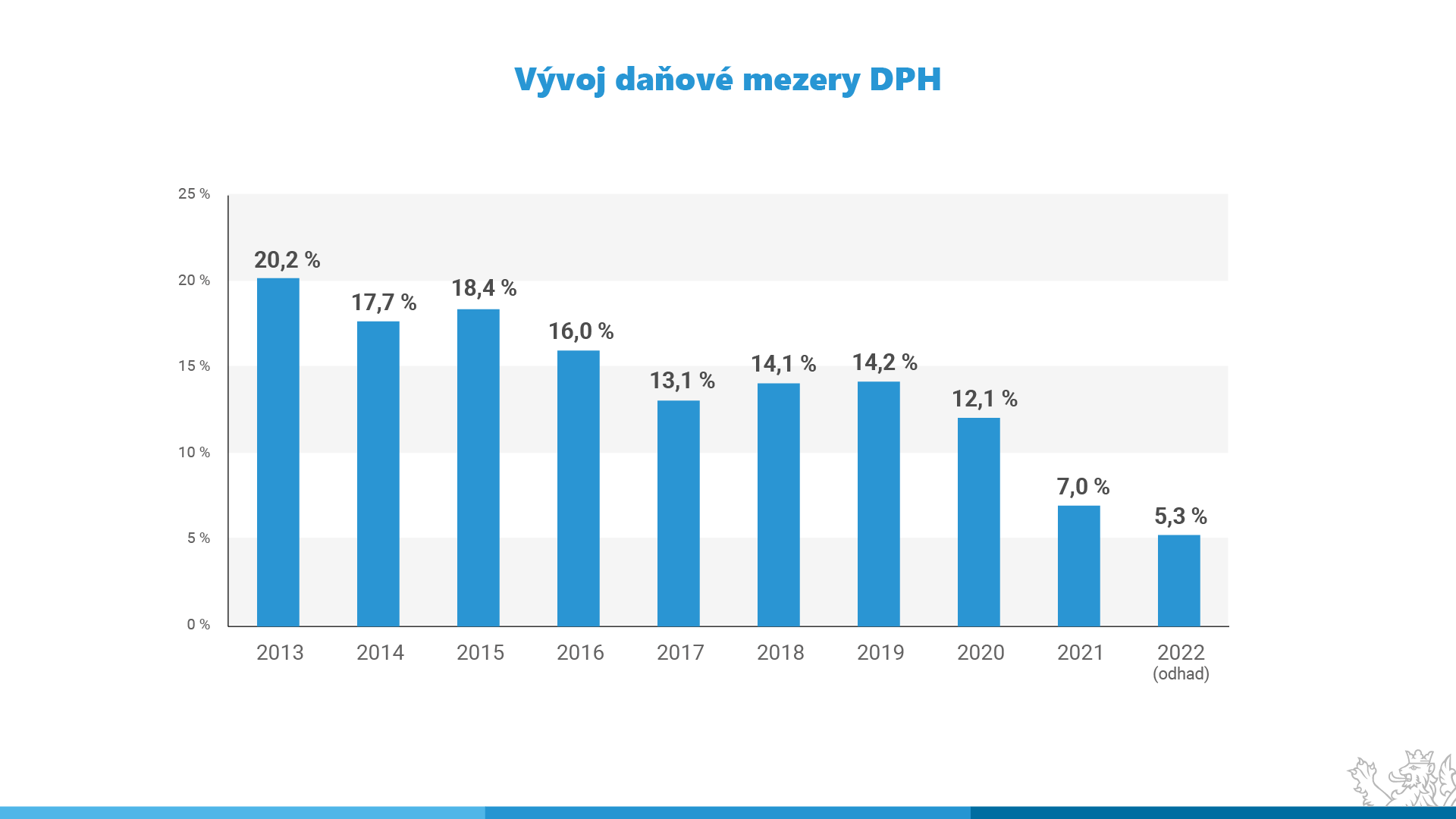 Ze zveřejněné studie vyplývá nebývalý pokles daňové mezery na DPH v rámci EU o více než 5 procentních bodů v roce 2021 oproti roku 2019. K významnému poklesu mezery došlo i v případě ČR, a to o více než 7 procentních bodů oproti r. 2019 na hodnotu 7 % teoretického daňového výnosu. Dle studie by měl klesající trend pokračovat i v roce 2022.