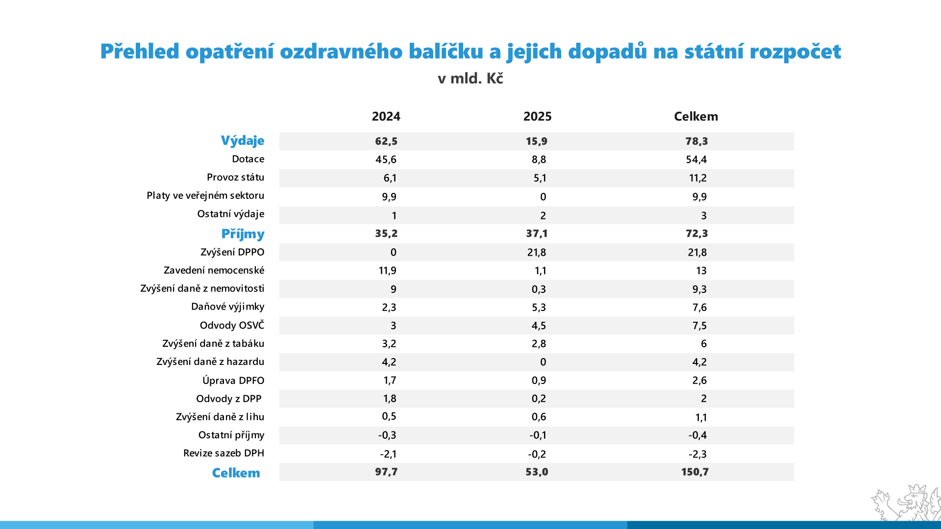 V nejvyšší míře se úsporná opatření dotknou národních dotačních titulů zejména pro podnikatele (54,4 mld. Kč), úspor na provozu státu (11,2 mld. Kč) a snížení objemu platů ve veřejné sféře (9,9 mld. Kč). Na příjmové straně dojde v letech 2024-2025 k celkovým úsporám 72,3 mld. Kč prostřednictvím růstu spotřebních daní z tabákových výrobků a lihu (7,1 mld. Kč), daní z hazardních her (4,2 mld. Kč), zrušení 22 daňových výjimek (7,6 mld. Kč), opětovného zavedení nemocenského pojištění pro zaměstnance ve výši 0,6 % (13 mld. Kč) či zvýšení daně z příjmů právnických osob na 21 % (21,8 mld. Kč), odvodů OSVČ (7,5 mld. Kč) a daně z nemovitých věcí (9,3 mld. Kč), jejíž inkaso je nyní pro veřejné finance zcela zanedbatelné a pro státní rozpočet dokonce ztrátové.