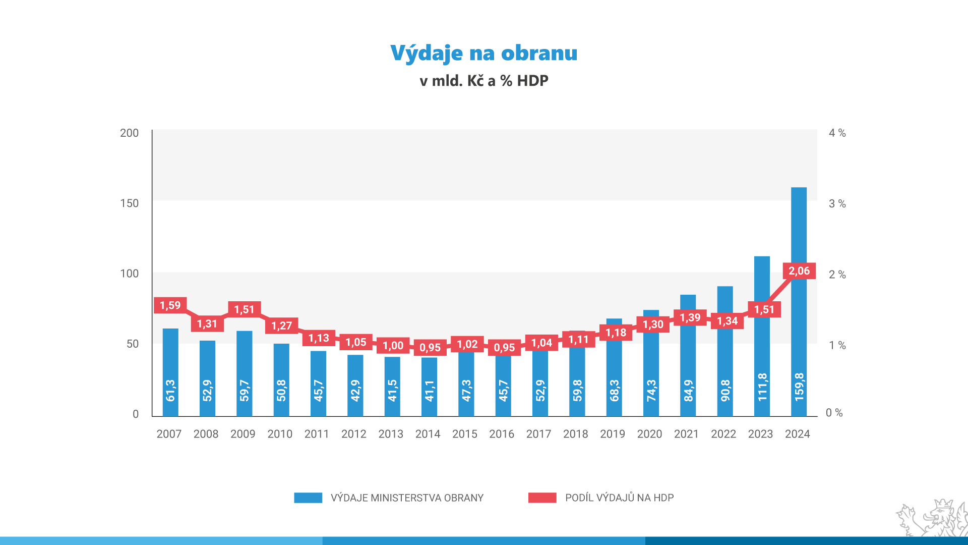 Do návrhu rozpočtu roku 2024 je mimo jiné plně promítnut závazek vlády vyčlenit na výdaje na obranu v příštím roce částku odpovídající 2 % HDP (téměř 160 mld. Kč). Tyto výdaje nejsou rozpočtovány pouze v kapitole Ministerstva obrany, ale i v kapitolách dalších resortů, jako například Správy státních hmotných rezerv, Ministerstva zahraničních věcí, Národního úřadu pro kybernetickou bezpečnost, Národního bezpečnostního úřadu nebo Ministerstva dopravy.