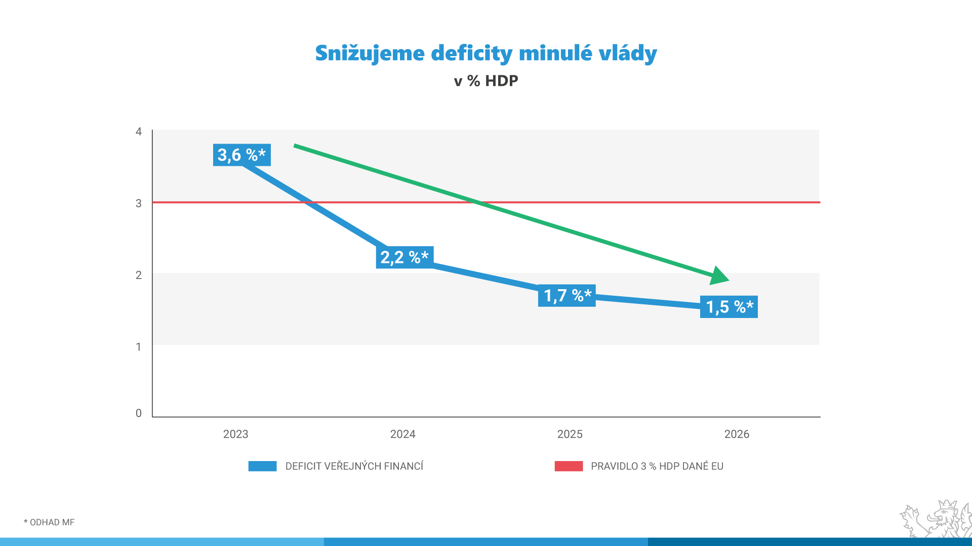 Ozdravný balíček, který míří k projednání Senátu ČR, pomůže ke zlepšení hospodaření veřejných financí a již v příštím roce se i díky němu sníží deficit veřejných financí na 2,2 % HDP z letošních odhadovaných 3,6 % HDP. V roce 2025 by měla konsolidace pokračovat a deficit klesnout na 1,7 % HDP. Střednědobý výhled Ministerstva financí počítá se schodkem rozpočtu ve výši 235 mld. Kč pro rok 2025 a jeho dalším poklesem na 220 mld. Kč v roce 2026.