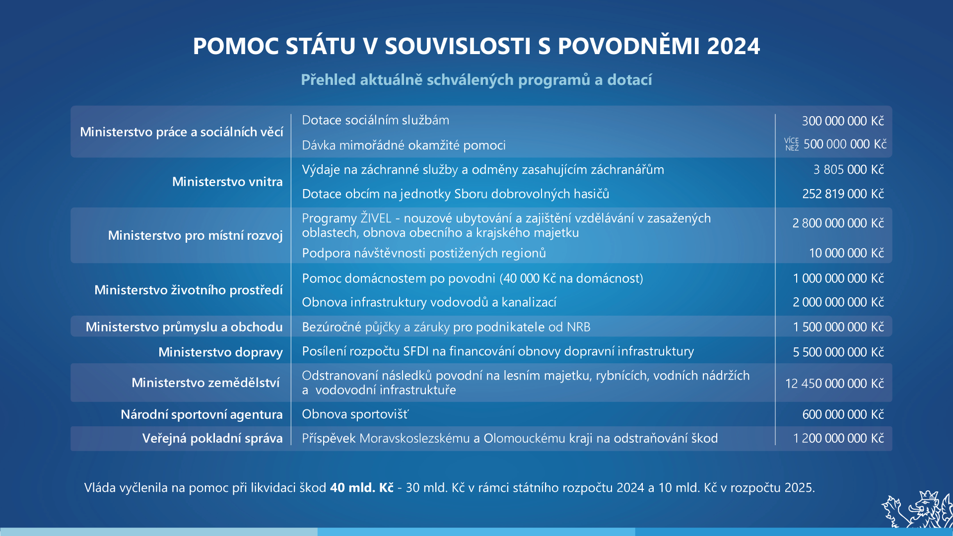Z národních prostředků půjde letos na likvidaci povodňových škod 30 mld. Kč a dalších 10 mld. Kč je vyčleněno v rozpočtu na příští rok. „Jedná se o prioritu jak v rozpočtu roku 2024, tak i rozpočtu roku 2025. Jsem přesvědčen, že částka bude dostatečná," dodal ministr Stanjura s tím, že objem peněz státní pomoci byl určen na základě zkušeností z katastrofálních povodní z let 1997 a 2002, kdy se státní rozpočet podílel na škodách zhruba z 25 %. Schválených 40 mld. Kč by tak mělo stačit na pokrytí více než poloviny nyní odhadovaných celkových škod. Část nákladů na obnovu po povodních bude pokryta z komerčního pojištění, kdy pojišťovny v tuto chvíli odhadují výši pojistného plnění na 19,6 mld. Kč.