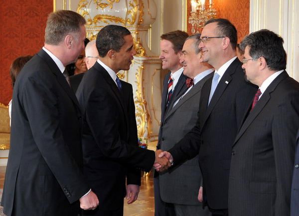 Ministr financí Miroslav Kalousek při setkání prezidenta USA Baracka Obamy se členy vlády ČR dne 5. dubna 2009