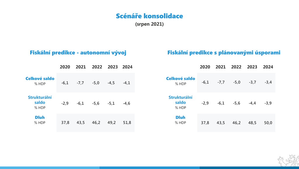 Ministerstvo financí počítá se zákonným plánem konsolidace, díky kterému se strukturální saldo bude snižovat postupně o půl procentního bodu HDP ročně. Takové tempo konsolidace považujeme za přiměřené, které nepoškodí rozjezd po pandemické krizi. Míra konsolidace je v souladu s doporučeními respektovaných světových ekonomických pracovišť a Evropské komise, které vydala ke Konvergenčnímu programu České republiky.