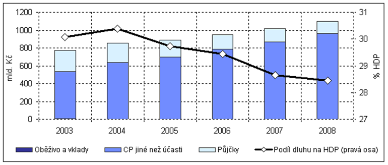 Převážná část deficitů veřejných rozpočtů bude financována formou úvěrů a vládních dluhopisů, jejichž objem dosáhne 1051,6 mld. Kč, tj. 27,7 % HDP. Je to však o 36,8 mld. Kč (0,8 p.b) méně, než se původně očekávalo. U podílu jednotlivých subjektů na zadlužení veřejných rozpočtů nedojde k žádným výrazným změnám. Nejvyšší váhu bude mít i nadále státní dluh (91,6 %) následovaný dluhem územních samosprávných celků a státních fondů (Státní zemědělský intervenční fond a Státní fond životního prostředí), které už k financování deficitů vyčerpaly peněžní zdroje a financují svá záporná salda dluhovými nástroji.