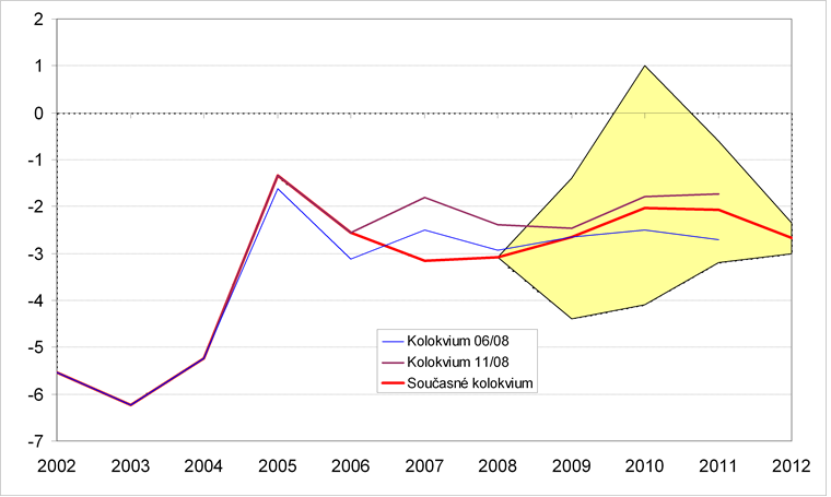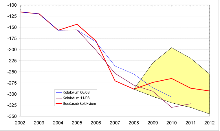 Grafické znázornění minulého a předpokládaného vývoje jednotlivých ukazatelů zachycují grafy 1–16. Pro porovnání jsou zahrnuty i konsensuální předpovědi dvou předchozích Kolokvií. Krajní predikce ukazatelů (sloupce min. a max. v tabulkách) tvoří hranice zvýrazněné oblasti.
