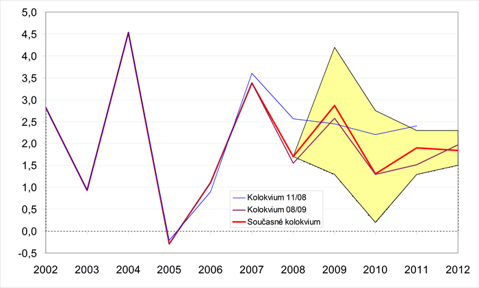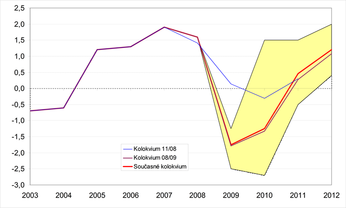 Pro rok 2009 očekávají instituce propad HDP v rozmezí 4,0-5,3 %. Svým odhadem poklesu hospodářství kolem 5 % se MF ČR řadí mezi instituce konzervativnější. Totéž platí i pro rok 2010, ve kterém je počítáno se stagnací či oživením české ekonomiky, přičemž ve srovnání s průměrem předpovědí MF ČR očekává mírnější oživení. Výhled na roky 2011 a 2012 pak staví říjnovou predikci MF ČR blízko středním hodnotám celého šetření (odchylka 0,4 p. b. v roce 2011 a 0,1 p. b. v roce 2012).