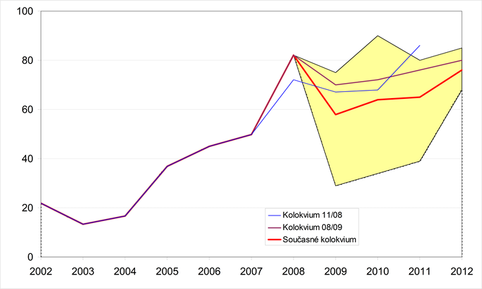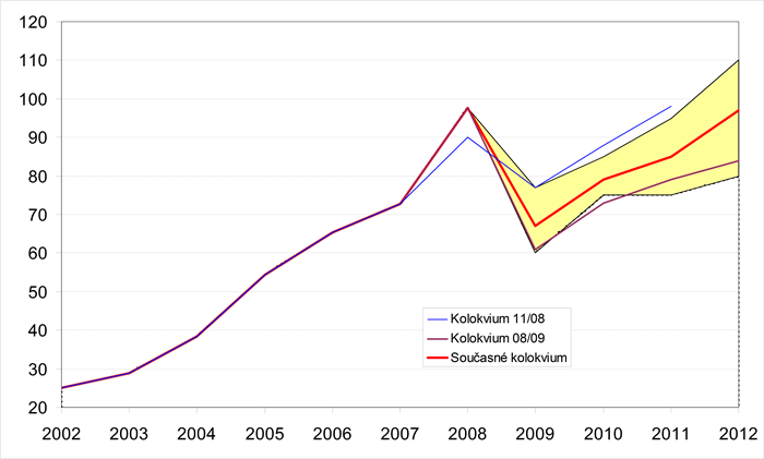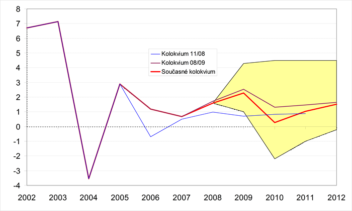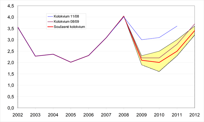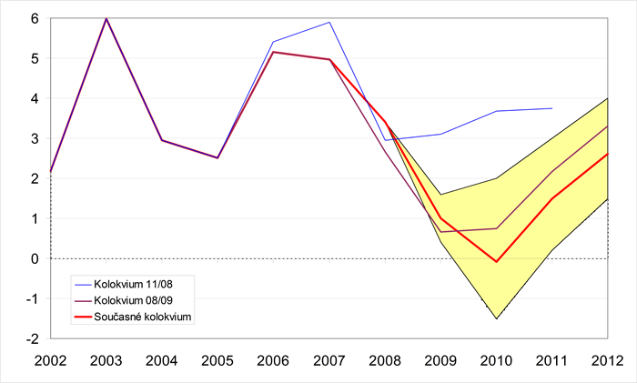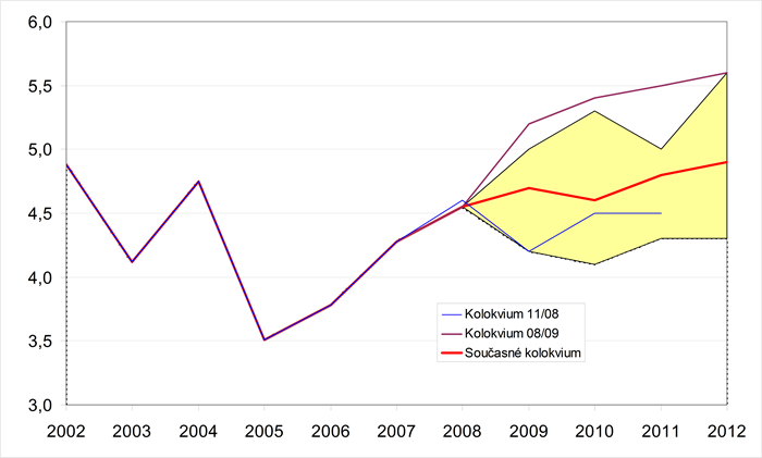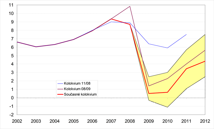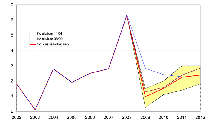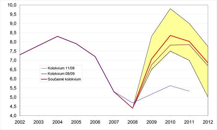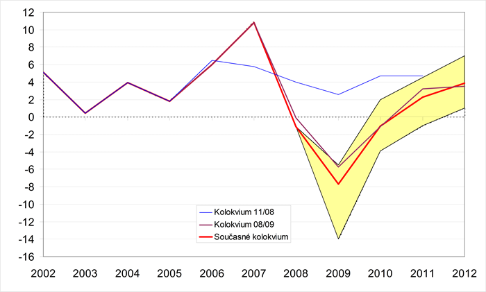 Grafické znázornění minulého a předpokládaného vývoje jednotlivých ukazatelů zachycují grafy 1-18. Pro porovnání jsou zahrnuty i konsensuální předpovědi dvou předchozích Kolokvií. Krajní prognózy ukazatelů (sloupce min. a max. v tabulkách) tvoří hranice zvýrazněné oblasti.