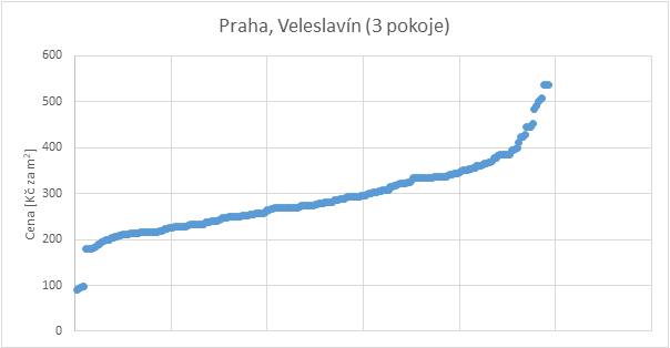 Jak je patrné ze shora uvedených příkladů, cena nabízených nájmů bytů se ve vysoké míře vyskytuje v uzavřeném shluku, a dále je vždy určitý menší výskyt hodnot lehce se vychylujících z mediánu a dále extrémů, které budou vždy v rámci čištění dat čištěny (podrobněji viz 2.7).